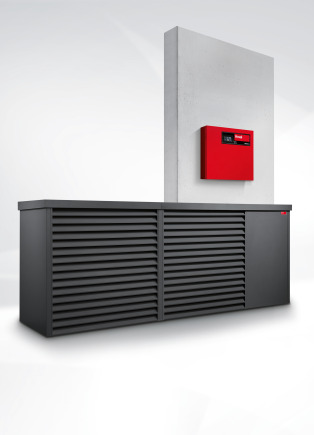 Ground-breaking monoblock heat pump for heating and cooling and generating hot water. Outdoor installation, operating module inside the house, flow temperature up to 70 °C, modulating.