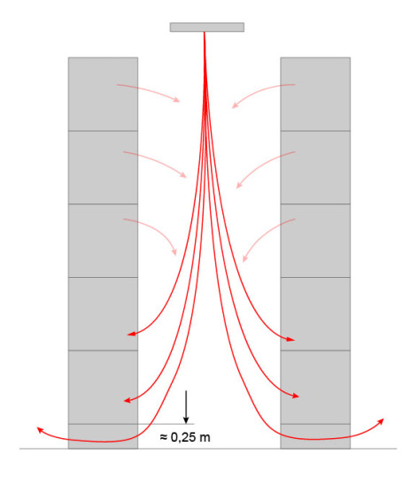 Rows of shelves restrict the rotationally symmetrical flow of torsion air distributors. The fronts of the rows of shelves act as walls as far as air flow is concerned, causing wall jets to form. These have a wider reach than open jets and a greater mounting height than is the case with free flow distribution. This increase can be up to 1.5 m.
