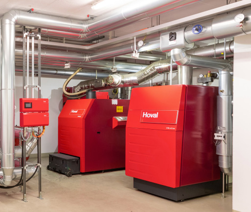Bivalent heating system consisting of UltraGas gas condensing boiler and BioLyt pellet heating system from Hoval.