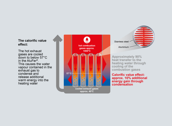 For more than 20 years, the UltraGas has impressed users around the world due to its durability and cost-effectiveness. The new UltraGas 2 gas condensing boiler also meets the highest demands: compared to a conventional gas boiler, the increased efficiency enables energy savings of up to 20%. Technical innovations such as the specially developed heating surface or the use of separate high-temperature and low-temperature returns increase efficiency and reduce gas consumption. The innovative Hoval TurboFer heat exchanger allows for operating temperatures of up to 95°C.