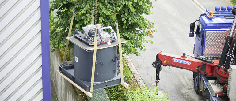 A milestone is the day the boiler was installed. The Hoval UltraGas 850 is delivered early in the morning. A crane hoists the gas boiler into the basement. All those involved in the planning are on site: customer Benjamin Gärtzner, Hoval coordinator Giuseppe Campanella and also project manager Pascal Müri from Kocher Heizungen AG, which is carrying out the upcoming installation work. You can feel the mutual trust that has developed between the customer and Hoval during the evaluation and planning process. Gärtzner is convinced that he has made the best choice: the natural gas-powered gas boiler offers efficient combustion technology of the latest generation. Out of responsibility for the environment.