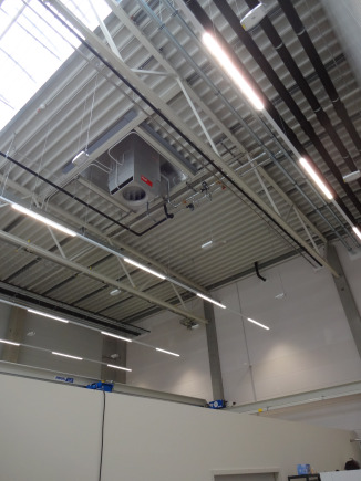 "The decisive element is the patented air distributor. With the adjustable guide vanes, the exhaust angle of the air is adjusted as required. The air is therefore blown in such a way that there are no drafts," says Hoval Product Manager Rainhard Ganster, explaining how the Air-Injector works. This creates an ideal working atmosphere for the employees. Even the light strip mounted at height remains unaffected by the air circulation.